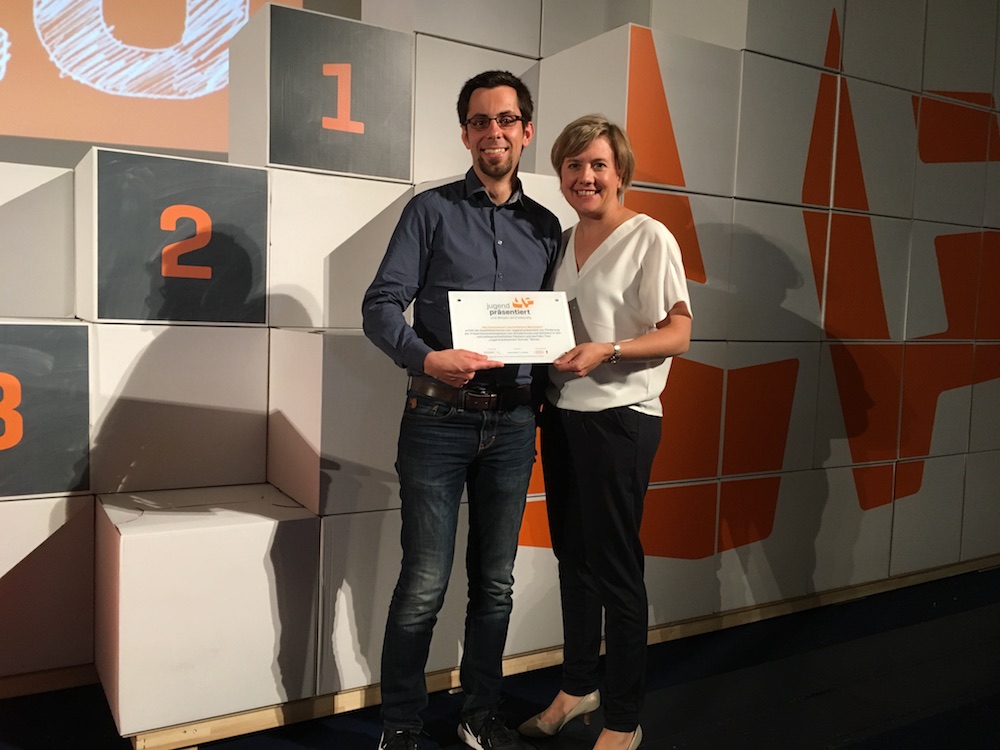 Das Bild zeigt Martin Helfen und Anne Schoppmeier-Söhrn bei der Übergabe des Siegels „Jugend präsentiert-Schule“ in Berlin.