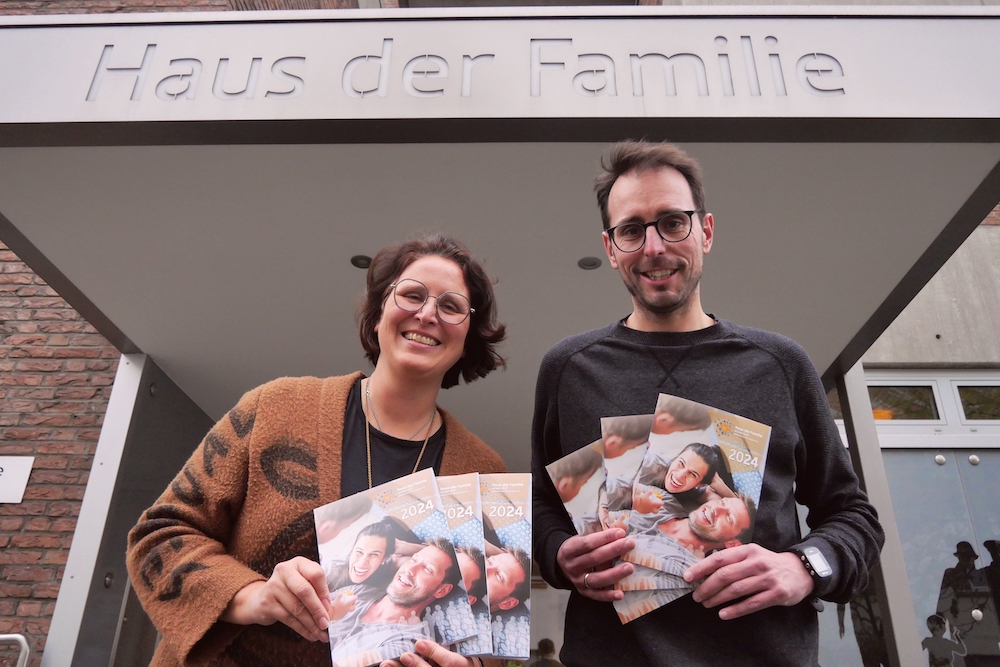 Isabella Matic und Benedikt Patzelt stellten das Programm 2024 für das Haus der Familie vor, das in gedruckter Form und – noch ausführlicher – im Internet zum #Aufbruch einlädt