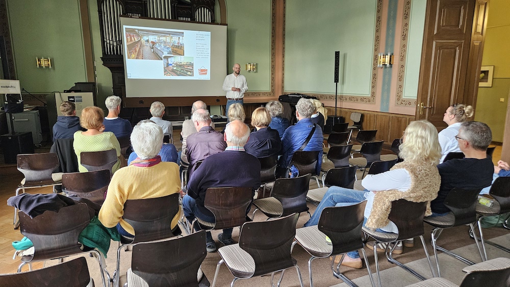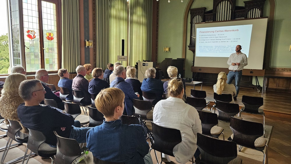 Dr. Ansgar Seidel, Vorstandssprecher des Caritasverbandes im Kreisdekanat Warendorf informierte über die Arbeit der Caritas im Kreis Warendorf in der Aula des Alten Lehrerseminars. Mitreißend und praxisnah gab er Einblicke in die Arbeit des Verbandes mit seinen über 50 Einrichtungen und fast 2000 Mitarbeitenden. Hierbei stellte er insbesondere die Tätigkeitsbereiche, die Einrichtungen, die Finanzierung als auch die aktuellen Herausforderungen und Chancen des Verbandes dar. Er unterstrich dabei den sozialen Auftrag der Caritas, Menschen in schwierigen Lebensumständen zu helfen. Ein gutes Beispiel sei u.a. der „Warenkorb“, der Menschen in Notlagen mit Lebensmitteln unterstützt. Hier bedankte sich Dr. Seidel ausdrücklich für die Spenden der Nachbarschaft zu Jahresbeginn, die diesem Projekt seit drei Jahren zum wiederholten Male zugutekamen.
