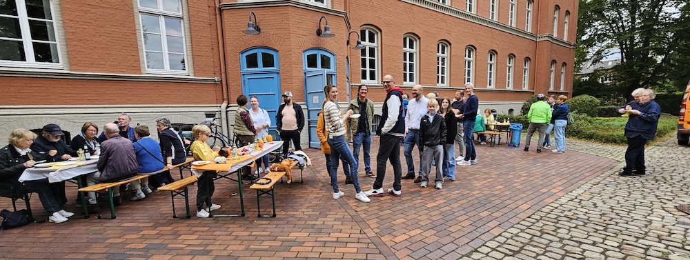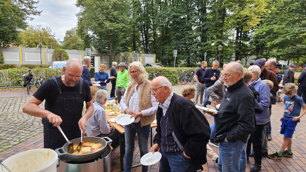 Nach so viel Input durfte der Genuss nicht fehlen: Nachbar Horst Kieskemper verwöhnte die Gäste mit frisch gebackenen Reibeplätzchen, die in geselliger Runde mit Apfelkompott serviert wurden. Dabei wurde angeregt geplaudert, gelacht und neue Kontakte geknüpft – Nachbarschaft, wie sie sein sollte.