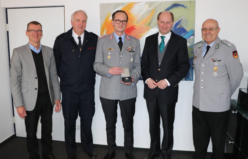 Eine Tischuhr mit Kreislogo erhielt OTL d.R. Kai Vogelmann (m.) von Landrat Dr. Olaf Gericke (2.v.r.) als kleines Dankeschön für seine Arbeit in den vergangenen Jahren. Gemeinsam mit Kreisbrandmeister Heinz-Jürgen Gottmann (2.v.l.) und Ralf Holtstiege (l.), Leiter des Amtes für öffentliche Sicherheit, Ordnung und Straßenverkehr, wurde bei dieser Gelegenheit auch Oberstleutnant der Reserve Gerd Meier (r.) in den Ruhestand verabschiedet.