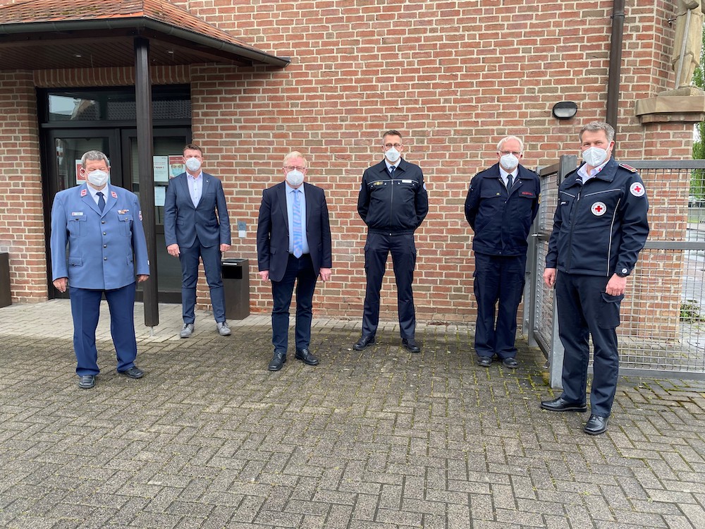 Das Foto zeigt von links nach rechts: Josef Weil (MHD, Stadtverband Warendorf), Detlef Weißenborn (DRK, Kreisverband Warendorf-Beckum), Reinhold Sendker MdB, Ralf Pelkmann (Dienststellenleiter THW Beckum), Heinz-Jürgen Gottmann (Kreisbrandmeister), Jens Peters (DRK, Ortsverein Warendorf).