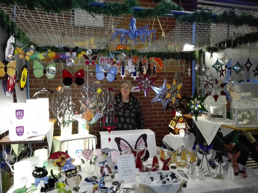 Hier gibt es viel zu entdecken, Adventsdekorationen, Schmuck in den verschiedensten Varianten, vom Gummibärchen bis zur Perlenkette, Papierverarbeitung vom Briefumschlag bis zur Geschenkverpackung, Kleidung für die Puppen, Kinder und Erwachsene, Holzarbeiten vom gedrechselten bis zur Palettenverarbeitung, Keramik, Filzarbeiten, Gestricktes und Genähtes, Bilder, Hobbyweine und Dörrobst, Essig und Dippspezialitäten, Figuren, Tiffany, handgefärbte Wolle, Honig, Vogelhäuser, Pralinen, regionale Produkte vom Hofladen aus Bad Laer und vieles mehr.