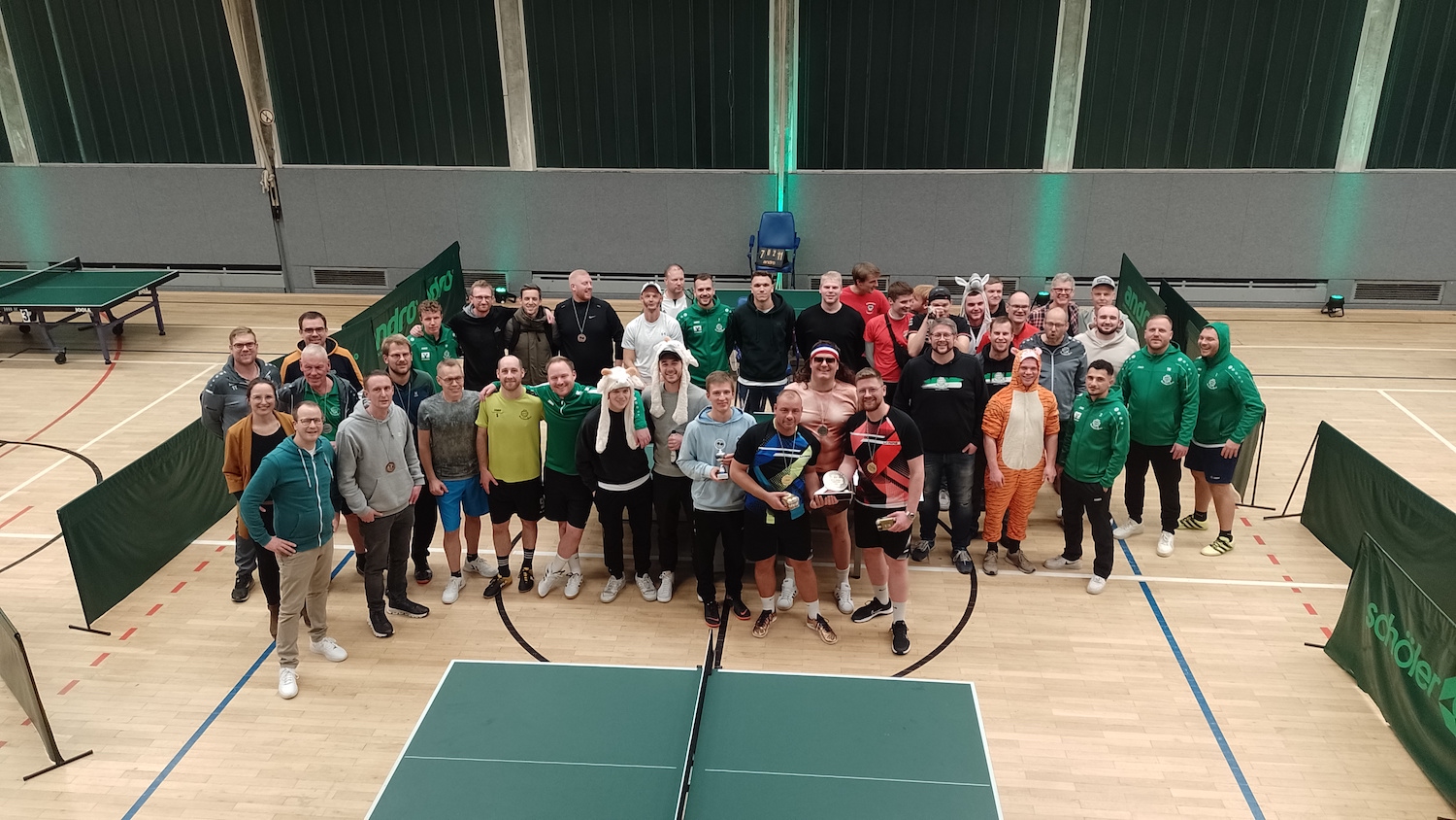Westkirchen (B.S.) – Im Rahmen des 100-jährigen Vereinsjubiläums von GW Westkirchen hat die Tischtennis Abteilung Mitte Dezember ein Hobbyturnier ausgerichtet. Insgesamt 32 Zweiermannschaften hatten sich angemeldet und sorgen für ein gro0es Teilnehmerfeld. Die Teams setzen sich aus Familienmitgliedern, Freundeskreisen, Kombination aus Nachbarschaften und GW-Sportabteilungen zusammen. In den acht Vierergruppen ging es los und die ersten beiden einer jeden Gruppe qualifizierten sich für das Achtelfinale. Kreative Namen wie das „M-Team“´, „Teuto Torpedo, “ die Royalen oder „die Galaktischen, um nur einige zu nennen, kämpften motiviert und ehrgeizig bis in den späten Freitagabend um die Plätze. Am Ende sicherte sich das Team „Doppel DT“ mit Daniel und David Teichert die 3. Westkirchener Kelle. Der zweite Platz ging an das Team „Obidrom“ mit Alexander Eidhoff und Heiner Mentrup. Platz drei sicherte sich das Team „Timbo“ mit Tim Radke und Robin Grosch. In der Klasse der ehemaligen Tischtennisspieler wurde nach dem Modus jeder gegen jeden gespielt. Hier setzte sich Joscha Steinkamp durch. Mit nur zwei abgegebenen Sätzen war dieser Erfolg souverän. Deutlich knapper waren die Ergebnisse auf den Plätzen zwei bis vier. Jeweils 3:2 Spiele konnten Frederik Mentrup, Jörg Latoschinski und Phillip Grentrup vorweisen. Das bessere Satzverhältnis verhalf dabei Frederik Mentrup den zweiten Platz. Dritter wurde Jörg Latoschinski.