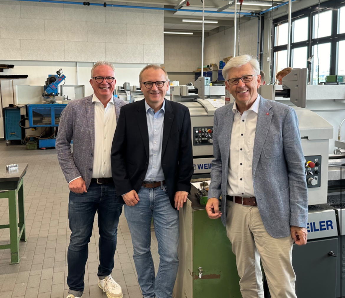 HWK-Präsident Hans Hund (rechts) mit Kreishandwerksmeister Heinz-Bernd Lohmann (Mitte) und Frank Tischner, Hauptgeschäftsführer der Kreishandwerkerschaft Steinfurt Warendorf in einer der modernisierten Werkstätten der Kreishandwerkerschaft Steinfurt Warendorf