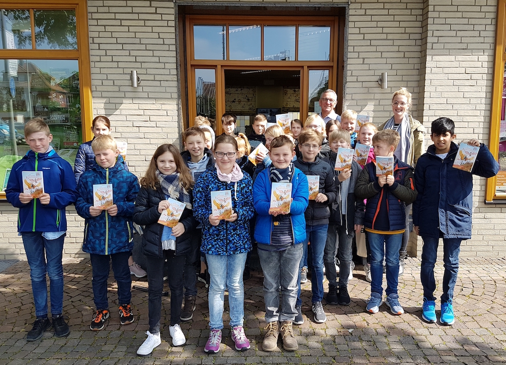 Foto: Die Klasse 5C mit ihrer Deutschlehrerin Marie-Christine Köster (h. r.) und dem Inhaber der Buchhandlung Ebbeke Reinhard Hesse freut sich über THiLO’s Geschichte ‚Der geheime Kontinent‘, die in dem Buch auch als Comic dargestellt wird.