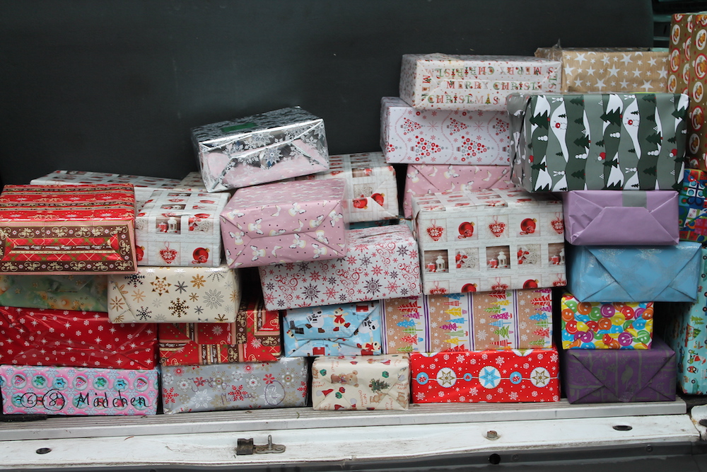 Auch Kindermasken können eingepackt werden. Die Kartons liebevoll in reißfestes Weihnachtspapier einpacken, aber ohne Schleifen und Bänder, damit sie im LKW später problemlos gestapelt werden können.