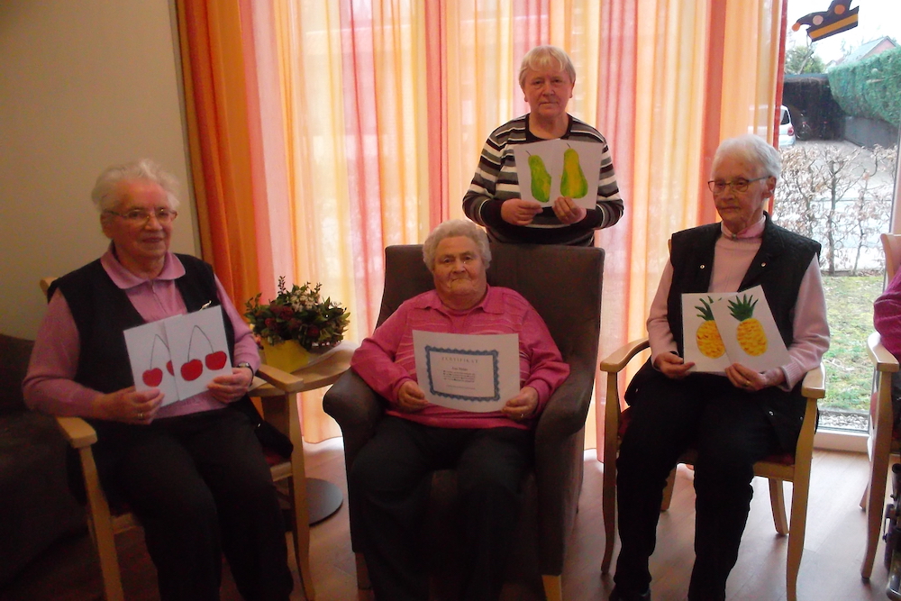 In der Sassenberger Tagespflege St. Josef nutzt man die gemeinsame Zeit gerne für Gesellschaftsspiele. Oftmals beeinträchtigen körperliche Einschränkungen die Spielfreude. Eine langjährige TP-Besucherin gab den entscheidenden Impuls: „Wir müssten ein Memory-Spiel gestalten, groß genug, dass auch betagte Augen es gut erkennen können! Gesagt – getan: Begeistert malte das Gäste-Team bunte Obstbilder im DIN-A-5-Format, die anschließend schnell laminiert wurden.
