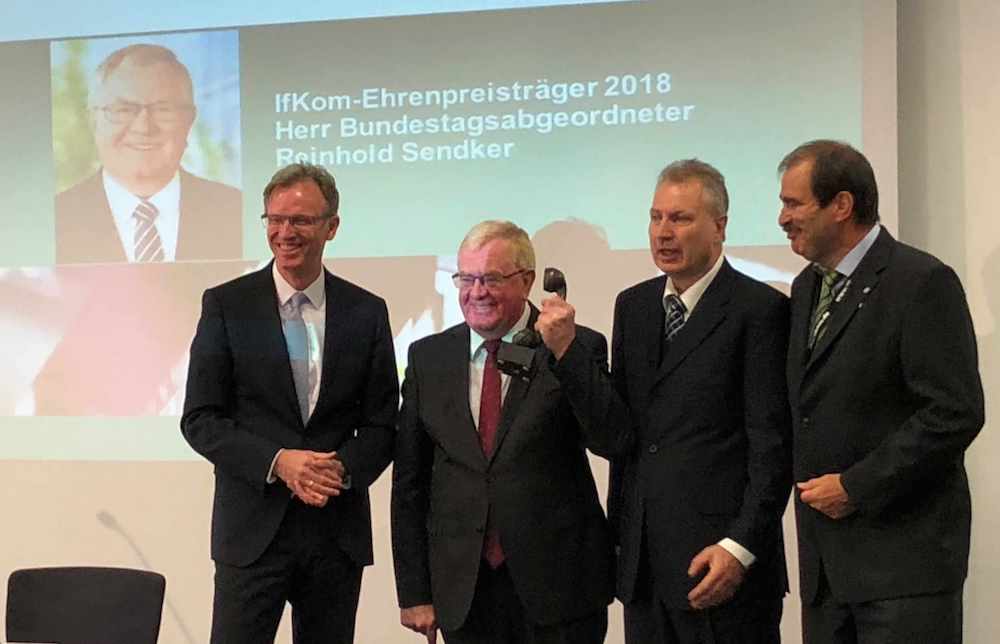Berlin / Kreis Warendorf. Der heimische CDU-Bundestagsabgeordnete Reinhold Sendker (Westkirchen) hat auf der Bundesversammlung der „Ingenieure für Kommunikation e.V.“ (IfKom) am vergangenen Wochenende eine hohe Auszeichnung erfahren. Er erhielt den IfKom-Ehrenpreis 2018 verliehen. „Mit dem Preis werden Menschen ausgezeichnet, die sich in besonderem Maße im Bereich von Kommunikation und Digitalisierung engagiert haben“, so der IfKom-Bundesvorsitzende Dipl. Ing. Heinz Leymann (Dortmund) in seiner Laudatio. Sendker reihe sich damit in eine Liste namhafter Preisträger ein, wie zum Beispiel dem langjährigen Bundestagspräsidenten Prof. Dr. Norbert Lammert.