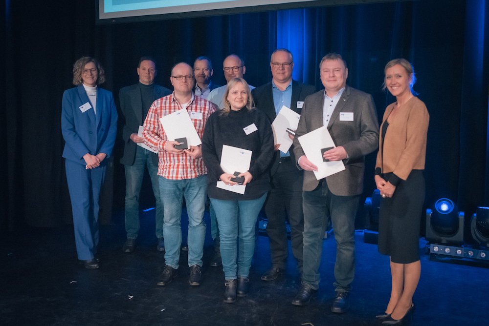 IHK-Vollversammlungsmitglied Dr. Silke Huster aus Warendorf (l.) und IHK-Vizepräsidentin Melanie Baum überreichten silberne IHK-Ehrennadel an (v. l.) Carsten Reichel, Christian Kriegers, Christoph Niehoff, Frank Westarp, Anja Geisler, Johannes Gatzemeier und Markus Döhring.
