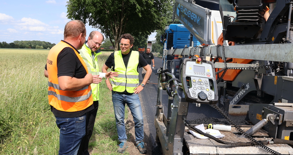 Bauleiter Alexander Hönemann (l., Gröschler Bauprojekt GmbH, Gütersloh) und Guido Evermann (r., Amt für Straßenbau, Kreis Warendorf) erläutern Landrat Dr. Olaf Gericke (m.) an der K24 bei Liesborn das Verfahren der Deckensanierung im Straßenbau. Im Hintergrund sieht man Einbaumeister Frank Gertheinrich (Fa. Gröschler).