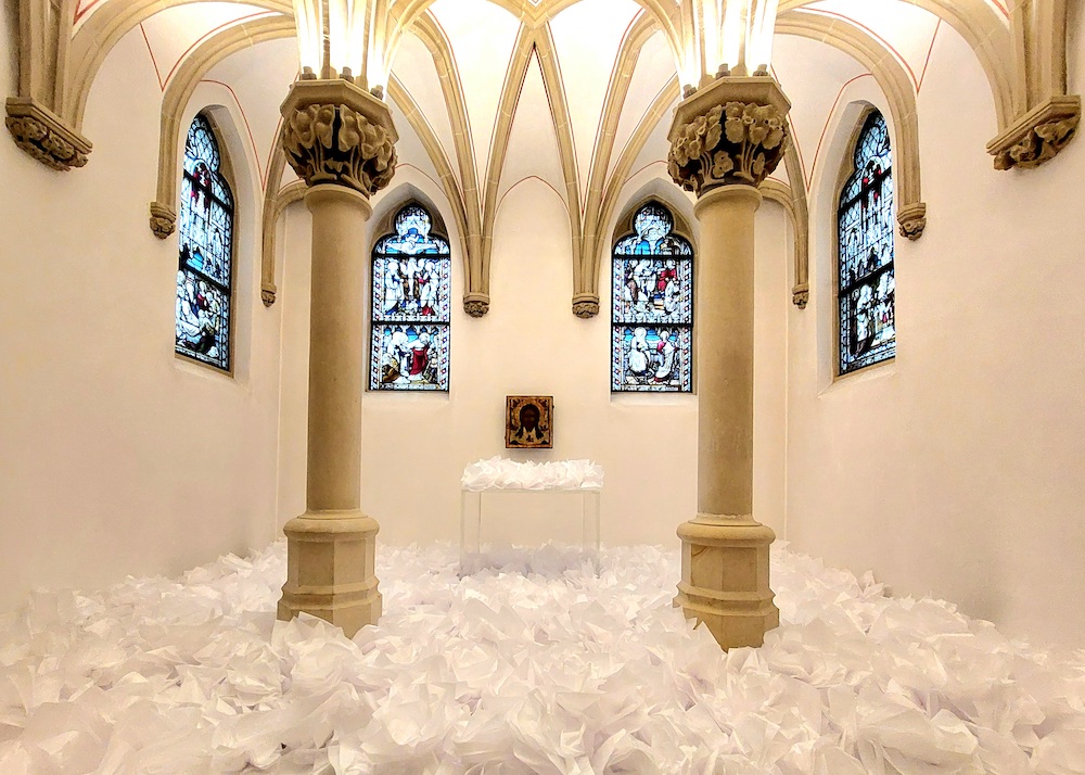 Die in Münster lebende Künstlerin nimmt den Text aus dem Buch Mose auf, in dem es heißt: „Der Herr sagt, komme nicht näher heran. Leg deine Schuhe ab, denn der Ort wo Du stehst ist Heiliger Boden“. Sie bedeckt dazu den Boden im “Raum der Stille“ mit weißem Papier und schafft eine neue Ebene.