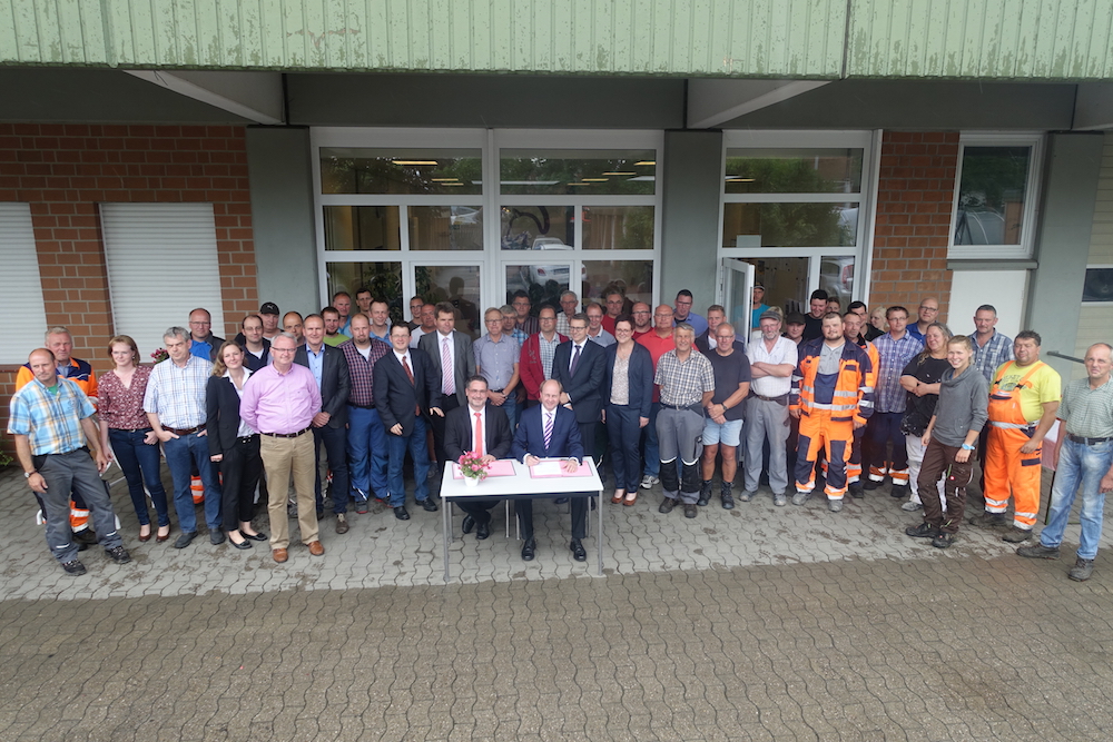 Anlässlich der offiziellen Vertragsunterzeichnung zum interkommunalen Bauhof der Stadt und des Kreises Warendorf hatte Bürgermeister Axel Linke Landrat Dr. Olaf Gericke und seine Mitarbeiterinnen und Mitarbeiter zu einem gemeinsamen Kennenlernen auf das Gelände Am Holzbach eingeladen.