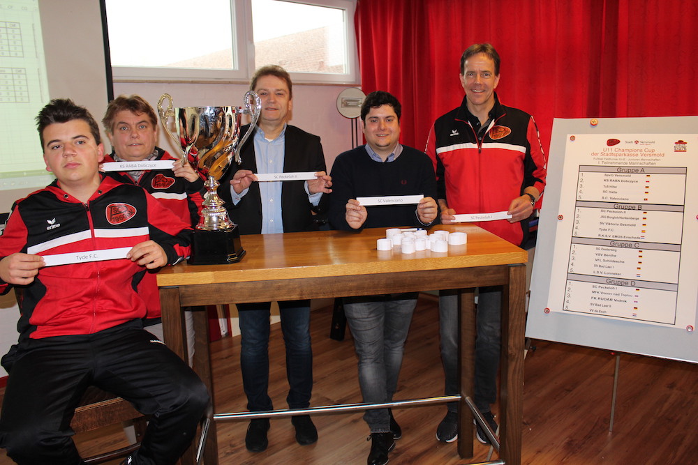 Besonders international geht es in diesem Jahr in Gruppe D zu: Hier treffen Mannschaften aus den Niederlanden, Serbien, der Slowakei und SC Peckeloh I aufeinander. Der SCP als Ausrichter des Turniers wird von der Stadt Versmold und von der Stadtsparkasse Versmold von Anfang an als Hauptsponsor unterstützt. Matthias Hauke vom Vorstand der Stadtsparkasse verkündete während der Auslosung eine gute Nachricht für den Peckeloher Verein: „Wir wollen auch über das Jubiläum hinaus gerne Hauptsponsor bleiben.“