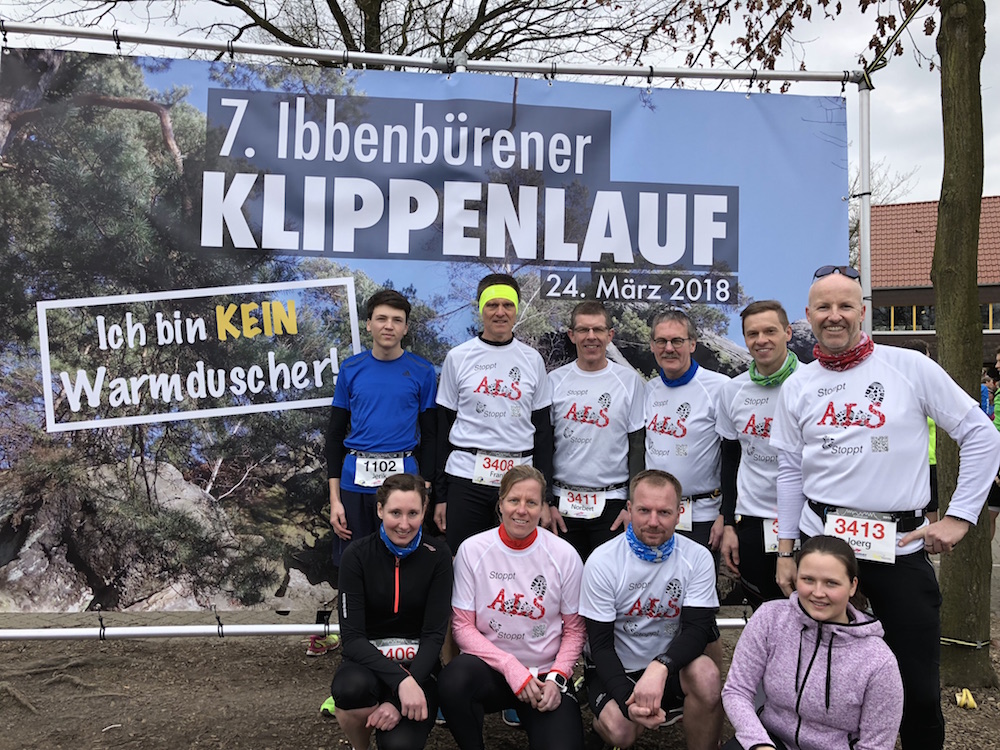 Dem Bild kann man auch entnehmen, dass viele der Lauftreffmitglieder den Klippenlauf zum Anlass nahmen, an das Schicksal von Steffen Auerswald zu erinnern. Der hervorragende Marathonläufer aus Freckenhorst ist an ALS erkrankt, hat dieser schlimme Nerven- und Muskelkrankheit aber die Stirn geboten und mit mehreren Aktionen auf diese hingewiesen (nähere Informationen unter: https://www.warendorfer-su.de/leichtathletik-lauftreff/leichtathletik-lauftreff-als). Für diese Aktionen wurden T-Shirts bedruckt, die viele auch für den Klippenlauf überstreiften.