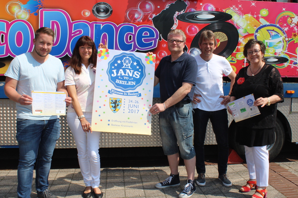 Unser Foto zeigt v. l. die Verwaltungsmitarbeiter Sascha Goedeke und Beate Kord, Ideengeber Martin Sievers, Fachbereichstleiter Manuel Rieping und Bürgermeisterin Elisabeth Kammann, die die offiziellen Plakate und Flyer der Gemeinde und Kirmes präsentieren, die gut strukturiert und übersichtlich alle wichtigen Informationen bereit halten. Weitere Informationen unter www.beelen.de