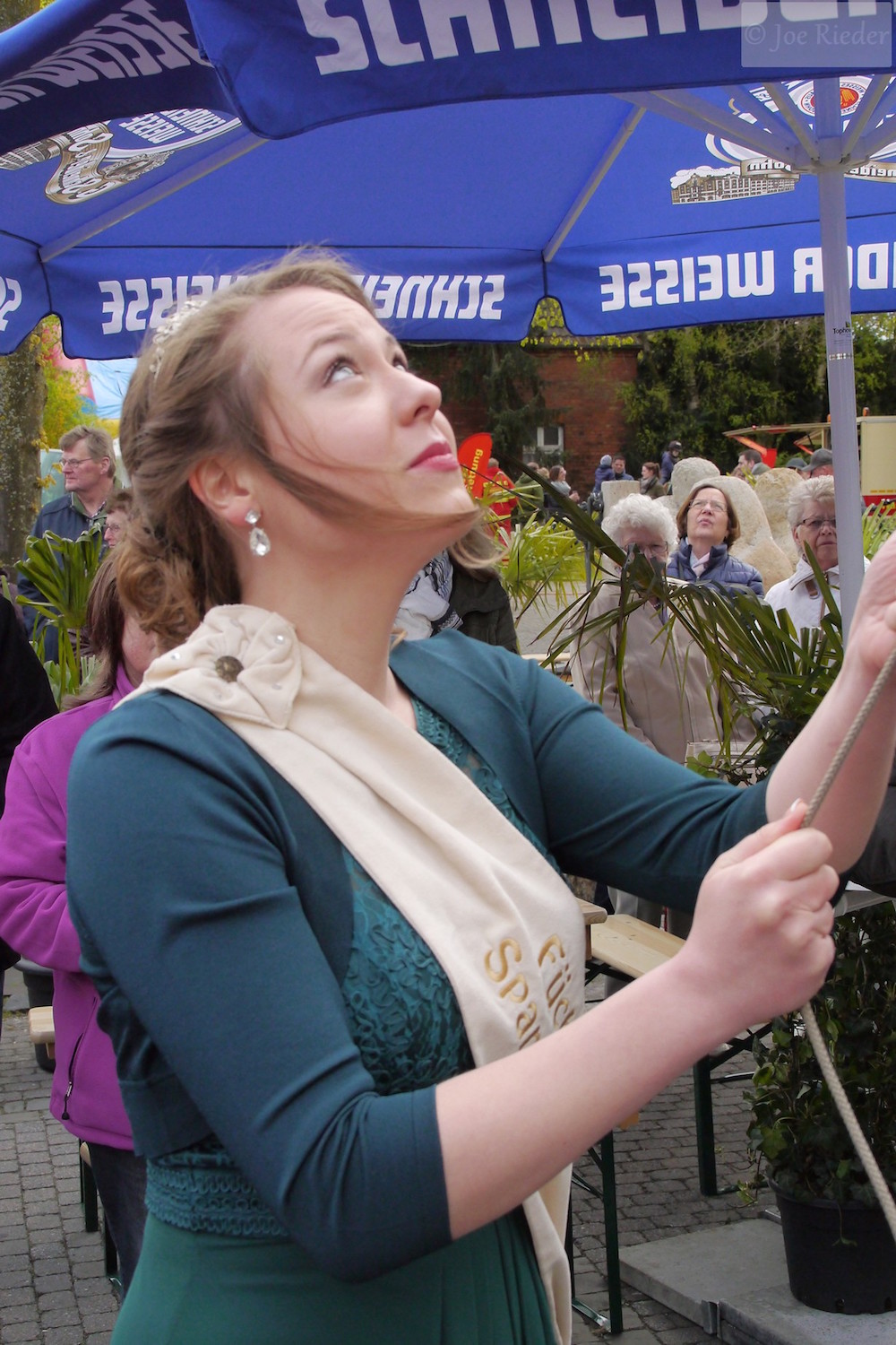 Schwamm drüber! Selbst die Königin selbst hatte es nur zwei ganz engen Vertrauten erzählt. Noch leicht nervös, aber mit bravourösem Charme meisterte sie ihren ersten Auftritt und freute sich über den Beifall der Besucher und die Glückwünsche der Ehrengäste. Zu ihnen zählten, neben dem Landrat und Bürgermeister Josef Uphoff auch die Pflaumenkönigin aus Oelde-Stromberg, Sandra Mense, und die bezaubernde Jacqueline Osthoff, Schachblumenfee aus Sassenberg und somit zweite Repräsentantin der Stadt. Johanna Peter, die im bürgerlichen Leben in Osnabrück ein Duales Studium im Finanz- und Steuerrecht absolviert, hisste im Anschluss noch die Spargelfahne und damit war der offizielle Teil beendet.