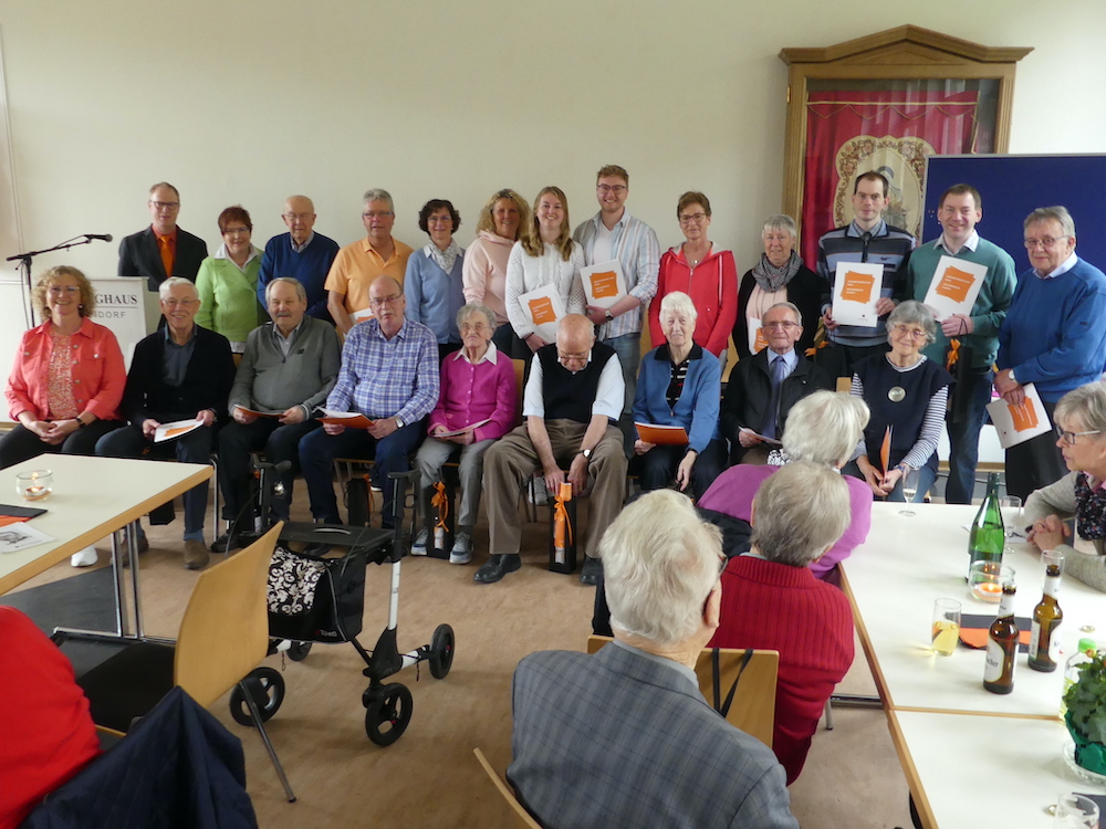 Für ihre mehrjährige Mitgliedschaft in der Kolpingsfamilie Warendorf wurden geehrt hinten von links Franz-Josef Hälker, Anne Löhrs (beide Vorstand), Manfred Koch (60 Jahre), Andreas Löhrs, Ellen Seck, Ursula Löhrs, Sven Korte, Maren Korte, Brigitte Kaiser, Elisabeth Dopheide, Thomas Austermann, Andreas Austermann (alle 25 Jahre), Johannes Wulf (60 Jahre).