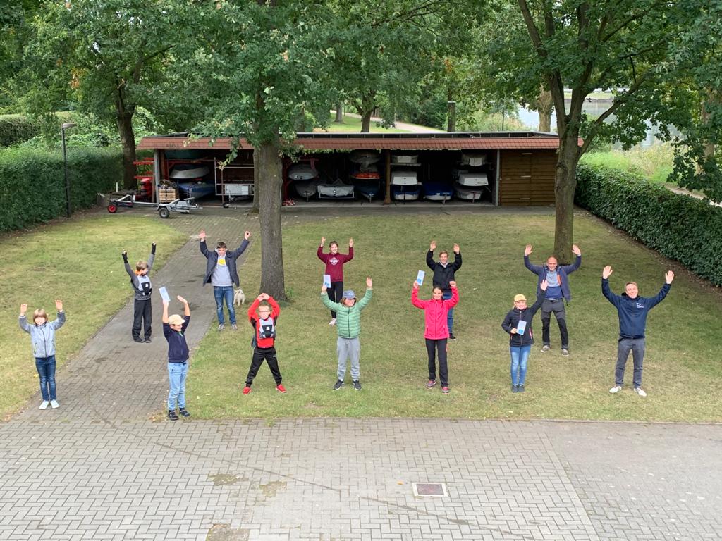 Die Jugendgruppe und ihre Trainer freuen sich mit Annbritt, Franziska, Maximilian und Jorias über die bestandene Segelprüfung.