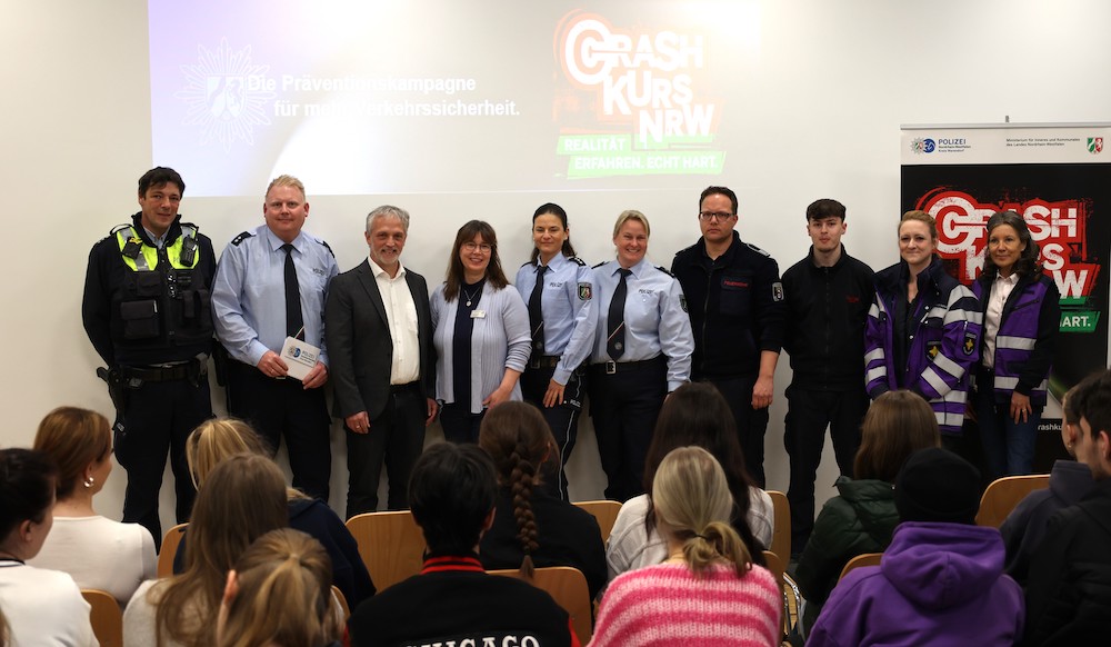 Zum 12. Mal hat der Crash Kurs NRW der Kreispolizei Warendorf am Paul-Spiegel-Berufskolleg stattgefunden. Verkehrsunfallprävention ist das Anliegen dieser Veranstaltung, in deren Fokus junge Fahrerinnen und Fahrer stehen. Die Gruppe der 18- bis 24-Jährigen, so informierte Polizeioberkommissar Stefan Wellmann die Schülerinnen und Schüler im voll besetzten Selbstlernzentraum, habe einen verhältnismäßig hohen Anteil an der Verursachung von Unfällen. Unerfahrenheit, Selbstüberschätzung und das Bedürfnis, imponieren zu wollen, spielten hier eine große Rolle. Dies führe zu Fehlverhalten hinter dem Steuer in unterschiedlichster Form. Am häufigsten verzeichne die Statistik überhöhte Geschwindigkeit, Medikamentenmissbrauch, Drogen- und Alkoholkonsum, Ablenkung durch das Smartphone, Nichtanlegen des Sicherheitsgurtes und illegale Autorennen.