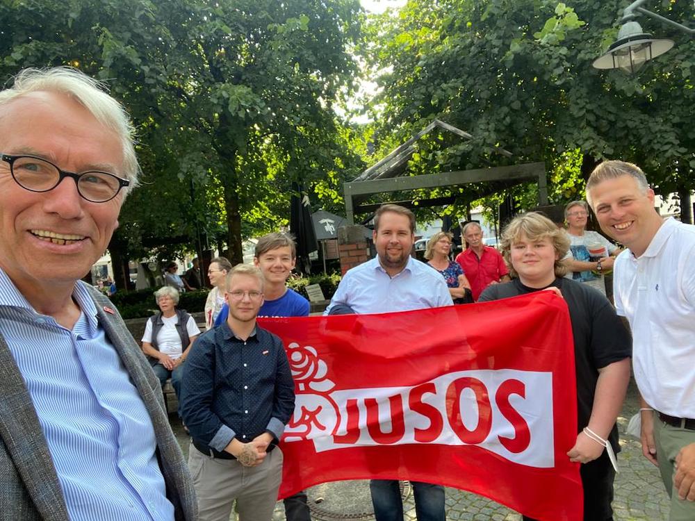 Im Rahmen der Demonstration gegen Rechts diese Woche in Ahlen hat sich auch die SPD-Jugendorganisation, die Jusos, vor Ort getroffen, um ein Zeichen gegen Faschismus und für unsere Demokratie zu setzen. Vor Ort trafen sie sich auch mit dem Bundestagsabgeordneten Bernhard Daldrup und dem Kreistags-Fraktionsvorsitzenden Dennis Kocker. „Es ist schon immer eine Kernaufgabe der Jusos, sich stark zu machen gegen rechte Tendenzen. Dazu gehört auch, aufzustehen gegen eine Partei, wie die AfD, die Rechtsextreme in ihren Reihen hat und duldet.“, betont der Juso-Vorsitzende Marco Zaremba. „Deshalb waren wir am Donnerstag gerne in Ahlen und freuen uns auch drüber, dass die Veranstaltung so gut besucht war.“
