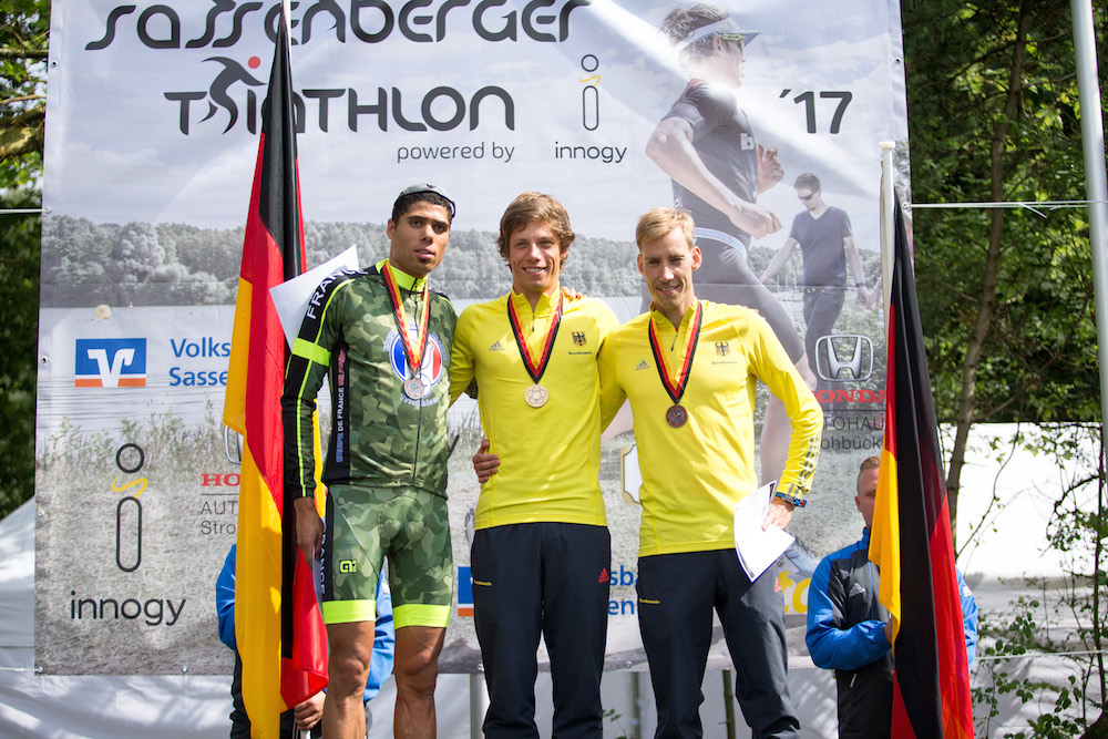 das Podium der Maenner mit v.l. Aurelien Raphael (Frankreich), Militaer-Weltmeister Justus Nieschlag und Jonathan Zipf (beide Deutschland)