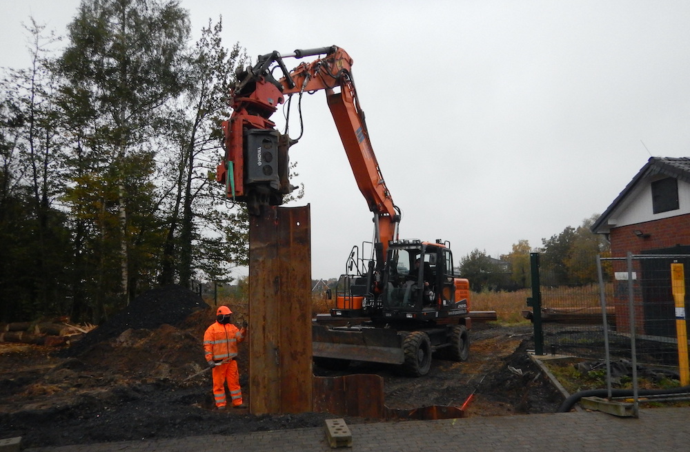 Für die Startbaugrube wurden Spundwände bis 7,5 m Tiefe in den Boden einvibriert (Foto) und der Boden innerhalb der Wände ausgehoben. Um die Baugrube trocken zu halten, läuft momentan die Grundwasserabsenkung. In knapp 5 m Tiefe wurde eine Schotterschicht eingebaut, auf der die s.g. Vortriebsmaschine eines Spezialunternehmens montiert wird. Diese wird sich wie ein Maulwurf innerhalb eines Stahlrohres von 700 mm Durchmesser auf 15 m Länge durch den Boden arbeiten.