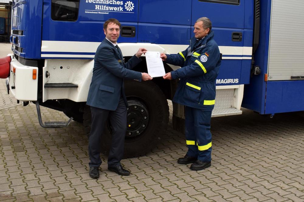 Bereits seit August 2020 ist Karl Bangel als Ausbildungsbeauftragter für den Ortsverband Warendorf der Bundesanstalt Technisches Hilfswerk (THW) aktiv. Bedingt durch Corona konnte er allerdings erst jetzt seine Berufungsurkunde aus den Händen des Ortsbeauftragten Mario Raab (Dienststellenleiter) in Empfang nehmen um seine neue Funktion nun auch offiziell ausüben zu können. Als Ausbildungsbeauftragter ist Karl Bangel neben der Überwachung des Ausbildungsstandes der Einsatzkräfte des Ortsverbandes und der Planung von Fortbildungsmaßnahmen unter anderem auch für die Durchführung der Grundausbildungsdienste verantwortlich, bei denen er vom stellvertretenden Ortsbeauftragten Guido Gawellek unterstützt wird. Des Weiteren vertritt er im Verhinderungsfall den stellvertretenden Ortsbeauftragten und übernimmt somit dann auch die Leitung des Stabes. In seiner neuen Funktion begleitete Karl Bangel auch die Grundausbildungsprüfung am vergangenen Samstag im THW Ortsverband Warendorf. An dieser nahmen fünf Anwärterinnen und Anwärter des Ortsverbandes erfolgreich teil. Karl Bangel hat erst im August diesen Jahres selbst seine Grundausbildung abgelegt. Das THW ist für ihn aber nur als Ehrenamtlicher neu. Bereits 2015 wechselte er als Beamter der Bahn zum THW, genauer gesagt zur Regionalstelle nach Münster. Mit Pensionierung Ende letzten Jahres galt es für Karl Bangel sein Engagement im THW fortzuführen. Nun als Ehrenamtlicher im THW Ortsverband Warendorf. „Ich freue mich sehr, dass Karl den Weg zu uns gefunden hat. Er wird unseren Ortsverband mit seiner Erfahrung und mit seiner Fachexpertise bereichern. Ich wünsche ihm viel Spaß bei seinen neuen Aufgaben.“, so der Ortsbeauftragte Mario Raab. „Das in mich gesetzte Vertrauen freut mich sehr und die neue Herausforderung bereitet mir jetzt schon eine Menge Freude.“, so Karl Bangel. Karl Bangel übernahm die Funktion des Ausbildungsbeauftragten von Robert Borchers, welcher diese Tätigkeit aus persönlichen Gründen aufgeben musste.