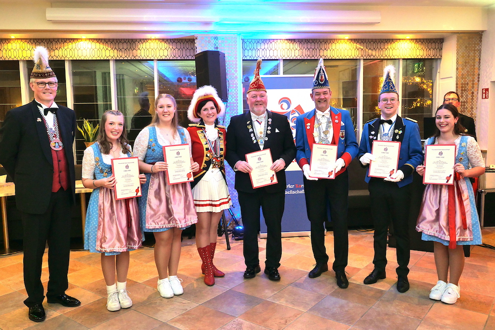 Für elf Jahre aktive Mitgliedschaft sind Carolin Brügge, Nina Marmann, Maja Erpenbeck (alle WaKaGe-Ballett), Gianluca Otto (Juka), Frank Kreimer (Elferrat) und Peter Böhm (Ehemalige Prinzen) ausgezeichnet worden.
