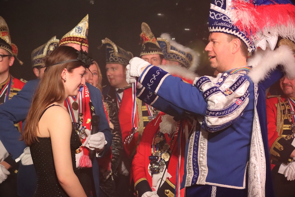 In diesem Jahr hieß das Motto des Karnevalsballs „Mary‘s Maskenball“. Ganze Gruppen von Schülerinnen und Schülern trugen originelle und unglaublich elegante Kleidung, edle Masken und schillernde Farben und verzauberten damit die Atmosphäre des Schulfoyers. „Schön voll hier und gute Stimmung!“, merkte auch die Warendorfer Karnevalsgesellschaft, die pünktlich zur verabredeten Zeit, um 19.20 Uhr, mit dem Prinzen und Gefolge durch die Halle zog. Oben auf der Bühne standen Fiona Hartmeier und Merlin Marggraf und erhielten für ihren besonderen Einsatz den Karnevalsorden von Prinz Matthias I. überreicht. Später brach dann die Bühne wegen der Wucht der vielen Tanzschritte an einer Seite zusammen, doch das verhinderte nicht, dass sich die unerhörte Stimmung bis in alle sonstigen Ecken verbreitete. Verletzt hat sich niemand.
