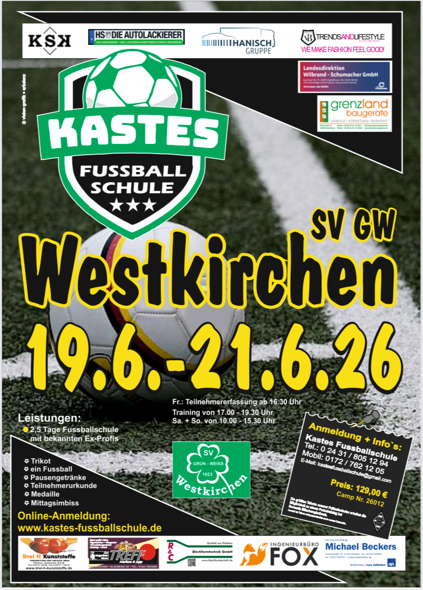 Westkirchen (B.S.) Die Fußballschule von Ex Bundesliga Profi Thomas Kastenmeier wird auch im kommenden Jahr in Westkirchen gastieren. In der Zeit vom 19.6.bis 21.6. 2026 hat „Kastes Fußballschule“ ihr Kommen zugesagt.  Anmeldungen nehmen der Sportverein unter info@gw-westkirchen.de und die Fußballschule unter kastesfussballschule@gmail.com schon jetzt entgegen. Der Preis für das 4. Fußballcamp in Westkirchen ist stabil geblieben, so der Organisator Christina Hunke und beträgt incl. Verpflegung und Getränke 129,00,-€. Die Verantwortlichen des Sportvereins freuen sich schon jetzt auf Thomas Kastenmeier und sein Trainerteam die den Nachwuchskickern/innen in mehreren Trainingseinheiten Praxis und Theorie näherbringen.