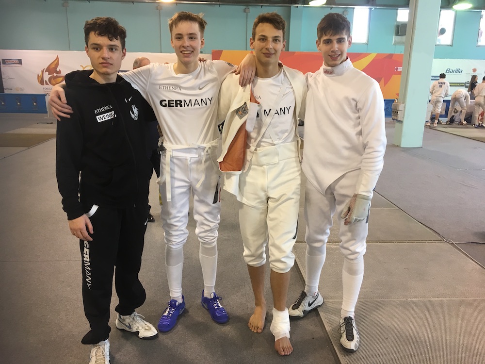 Zwei Tage später stand der Nationenwettkampf an, Cadet Men’s Epee Team! Das Deutsche Kadetten-Team mit den  Fechtern, Keanu Nagel (FC Krefeld), Fabio Murro (OFC Bonn) , Sedat Bakay (Tauberbischofsheim) und Cedric Fast (BTG Bielefeld) wurde nach den Einzelwettkämpfen an Platz 12 von 20 teilnehmenden Mannschaften  gesetzt. Das Team von Kadetten-Bundestrainer, Jörg Fiedler,  hatte einen schweren Start und nach anfänglicher 7 Punkte Rücklage, erkämpfte sich das Quartett schlussendlich den Einzug unter die letzten 16 gegen Finnland mit 45 zu 35 Treffern.  Die stark auftrumpfende polnische Mannschaft im 16er K.O. erschwerte es den Deutschen Fechtern gleich zu Beginn. Keanu Nagel traf es besonders hart, er punktete kaum gegen seine Fechtgegner und wurde noch vor Schluss ausgewechselt. In den letzten 3 Minuten übernahm der Schlussfechter, Fabio Murro, einen 38:40 Rückstand, ein wahrer Krimi ereignete sich auf der Planche No 8, im Livestream war alles live zu verfolgen, Murro erkämpfte sich Punkt für Punkt und so stand es 10 Sekunden vor Timeout 44:43! Der polnische Schlussfechter, Jan Socha, traf den Deutschen Fechter zum 44:44 zum Ablauf der regulären Zeit, im Sudden Death mit Vorteil Deutschland wurde Murro 15 Sekunden vor Schluss unglücklich unter der Hand getroffen. Aus der Traum vom Siegerlauf der letzten 8 in Foggia!
