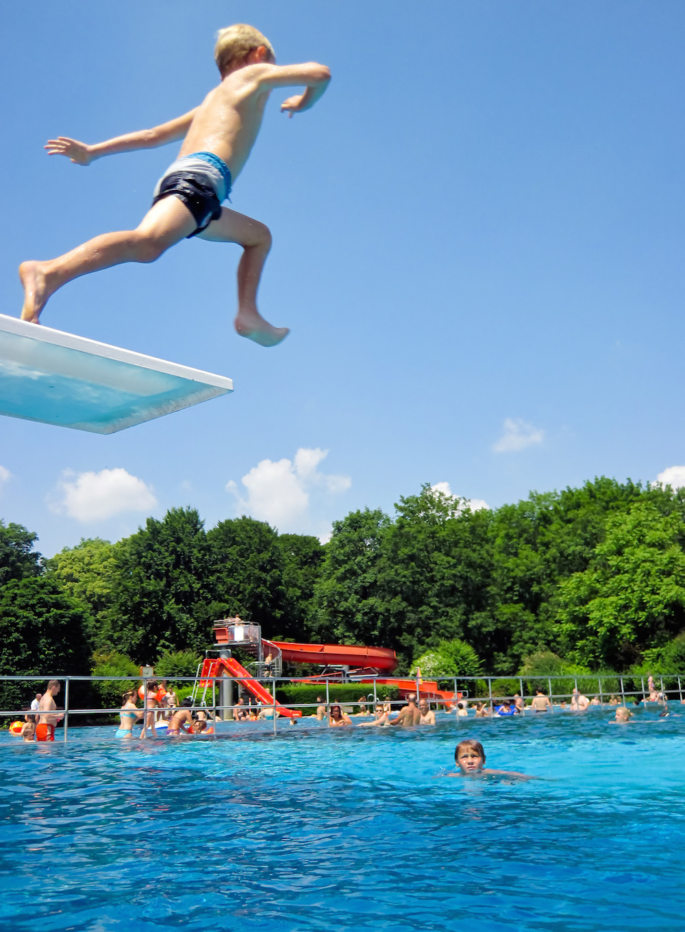 Ein Junge, 6 Jahre, springt vom Sprungbrett, im Freibad