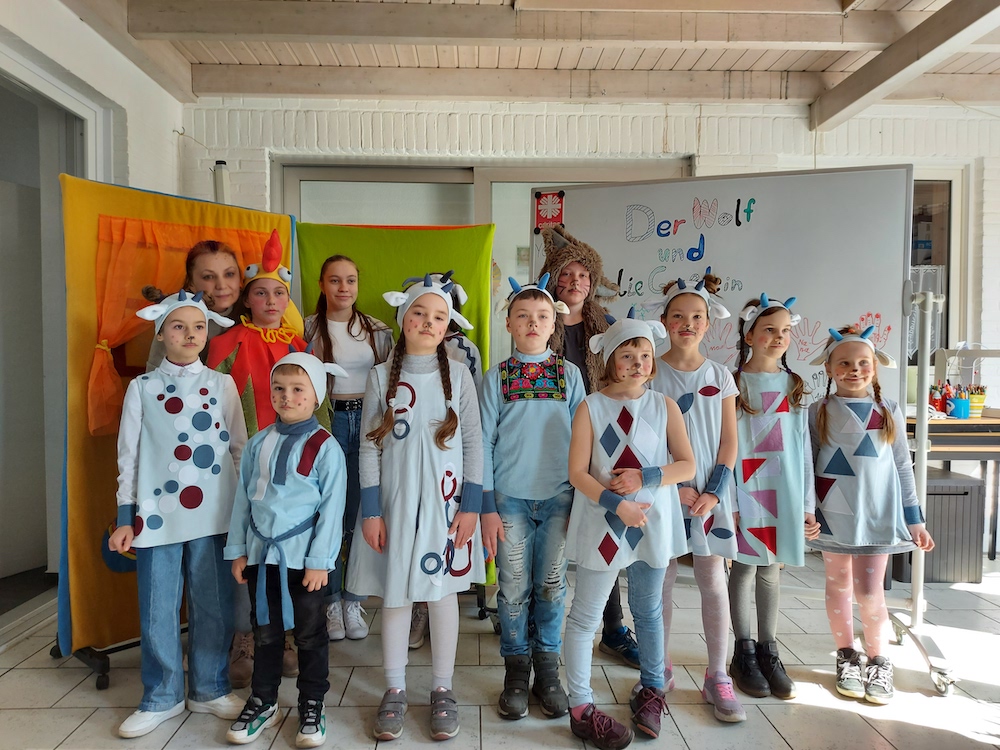 Eins dieser Projekte war das Theaterprojekt in der ersten Woche der Osterferien. 11 Kinder im Alter von 5 bis 13 Jahren waren bei der für sie neuen Erfahrung dabei. Auf dem Programm für die Projektwoche standen die Proben für ein Theaterstück zu dem Grimms Märchen „Der Wolf und die Geißlein“. Unterstützung bei den Proben bekam Marina Burkgard von der 15-jährigen Daria Barabanova.