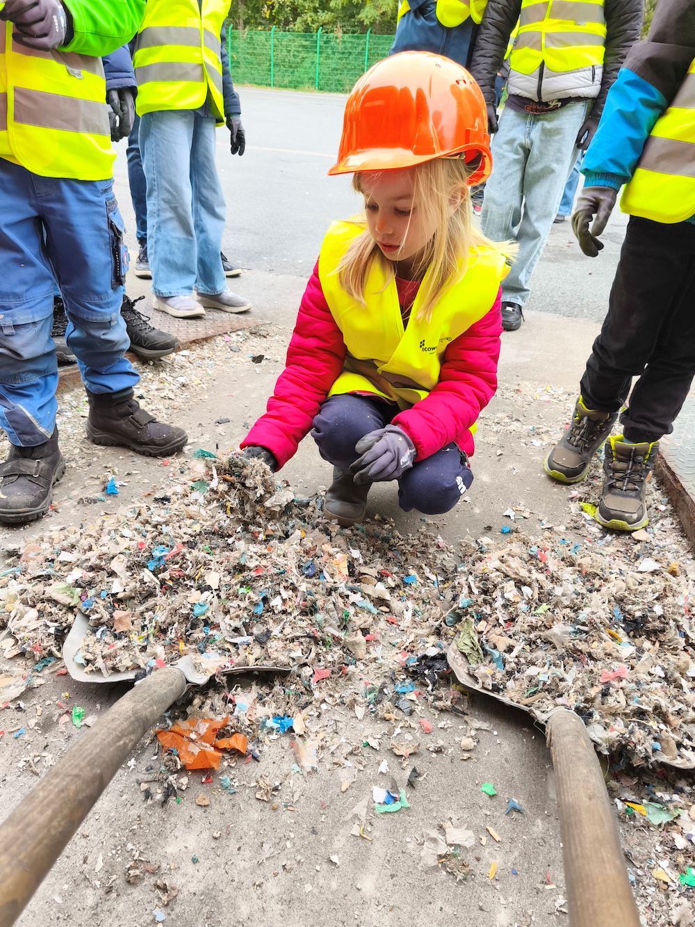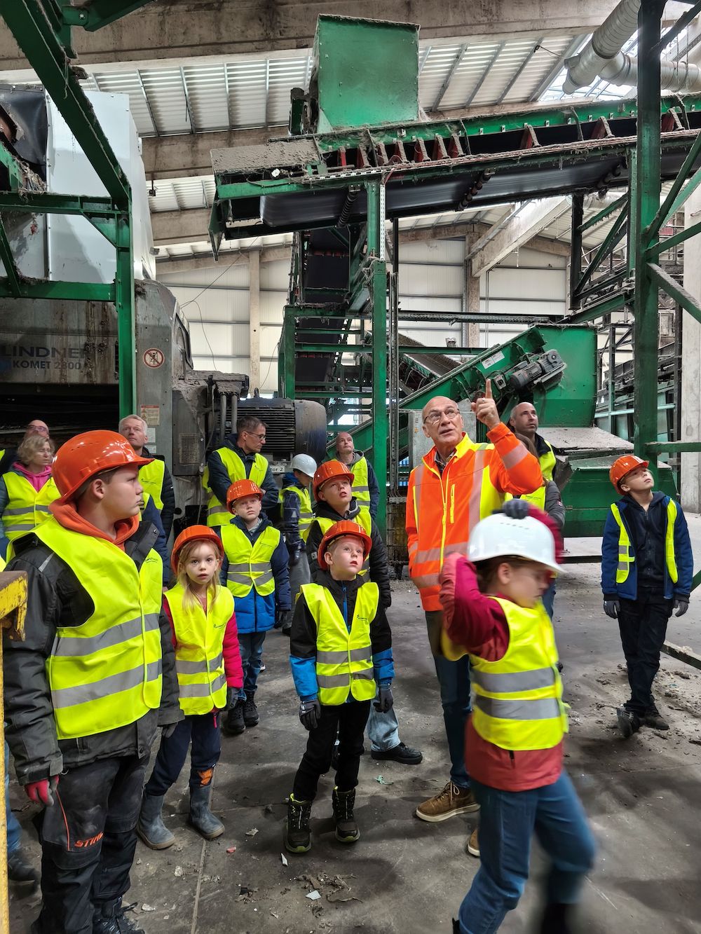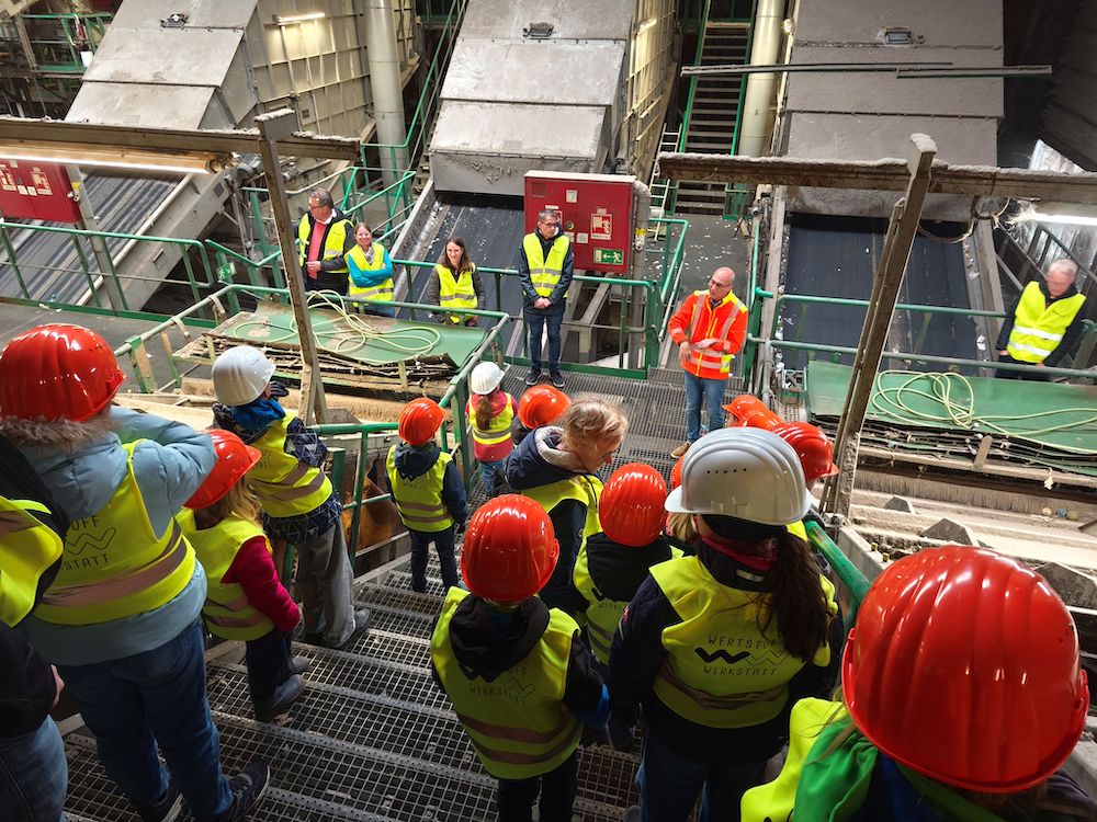 17 Kinder und ihre Eltern – etwa 40 Abfall-Detektive– sind gekommen, um zu entdecken, was mit ihrem Abfall passiert, sobald die Tonne zu Hause geleert ist. Aufmerksam stehen sie, ausgestattet mit knallgelben Westen und orangefarbenen Helmen, neben Michael Dierkes, der auf ein breites Förderband zeigt. „Hier geht’s los – in unserer Annahmehalle. Da wird euer Müll erst einmal zerkleinert.“ Die Kinder staunen. Das Band ist zwar leer, doch die Vorstellung, dass dort sonst gleichzeitig Unmengen an kaputten Haushaltsgegenständen, Windeln, Metallteilen und Kunststoffen gleichzeitig entlangrumpeln, löst Begeisterung aus. Dierkes erklärt, wie Magnetabscheider und Windsichter Metalle und Folien trennen, und wie Nahinfrarotspektroskopie erkennt, dass zum Beispiel PVC später im Ersatzbrennstoff nichts zu suchen hat. „Das ist unsere kleine Geheimwaffe“, sagt er schmunzelnd.