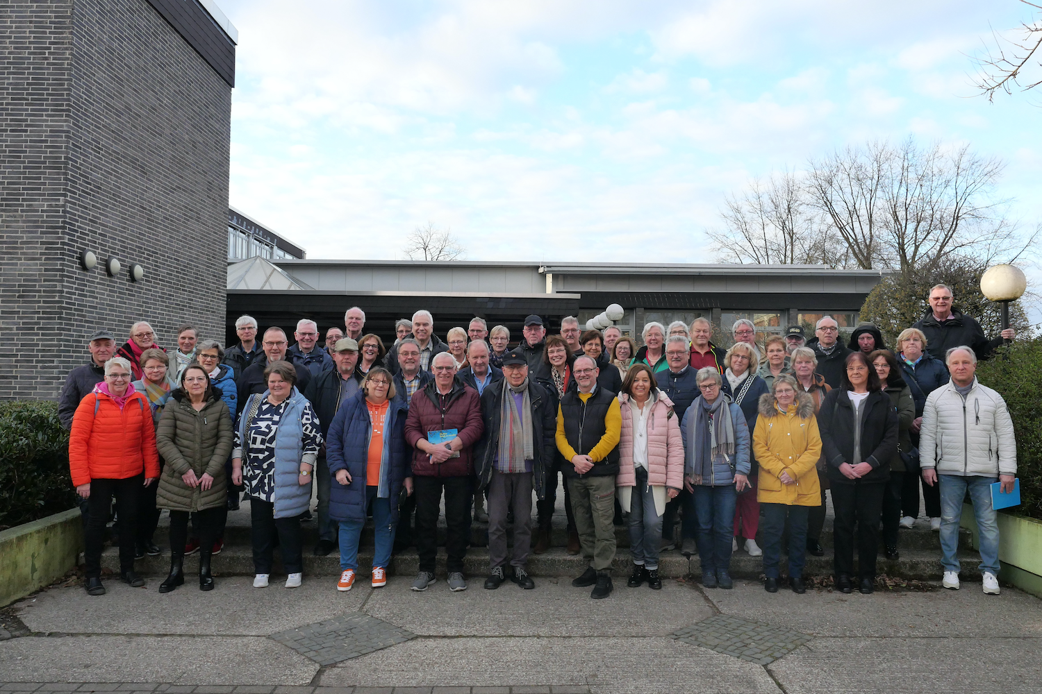54 Ehemalige waren der Einladung zur 50 Jahrfeier ihrer Schulentlassung gefolgt, und auch Lehrer Winfried Mersch (vorn Mitte) war dazugekommen