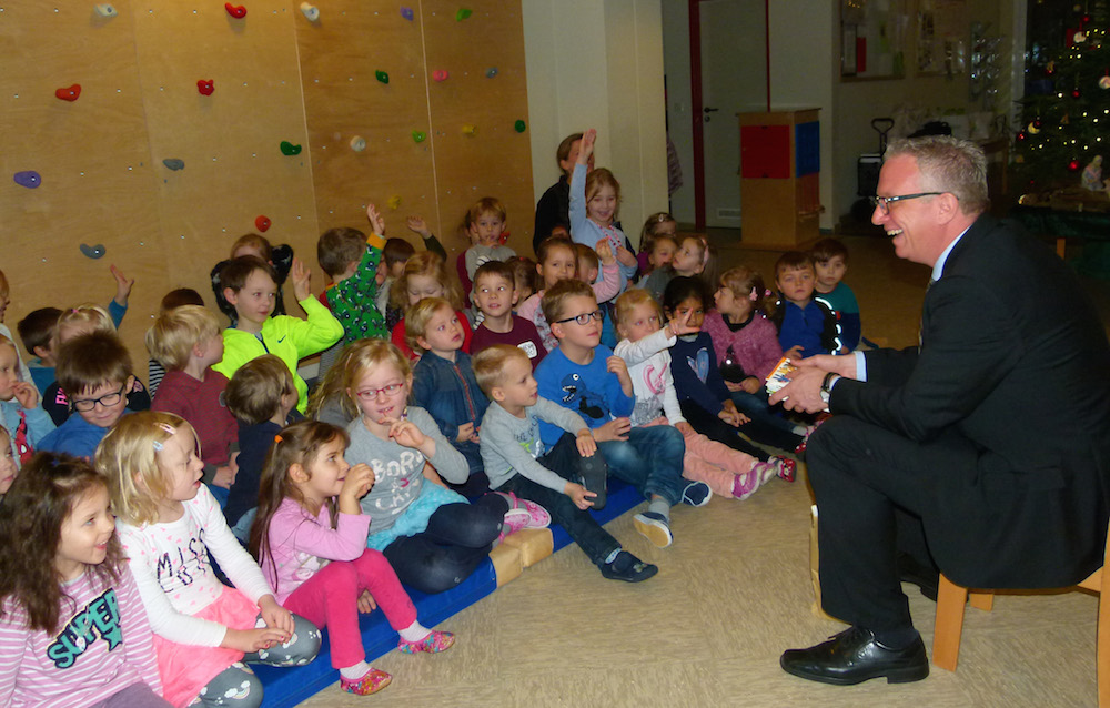 In den Pixi-Büchern werden Geschichten erzählt, wie Marie zur Handwerkerin wird, Lotte unterwegs mit den Spezialisten im Handwerk ist, Leonie vom Maler ein neues Zimmer bekommt und was man erlebt, wenn man zu Besuch ist bei Onkel Heiner, dem Schreiner. Die Kinder der Sonnenschein- und Marienkäfer-Gruppe zeigten sich schon durchaus bewandert im Handwerk, wussten doch viele auf Nachfrage von Frank Tischner einige Handwerksberufe zu benennen. Und passend zu den anstehenden Weihnachtsfeiertagen stimmten die Kleinen dann auch das Lied „In der Weihnachtsbäckerei“ an – sehr zur Freude des KH-Hauptgeschäftsführers, der zum Start in sein Berufsleben das Bäcker-Handwerk erlernt hat.