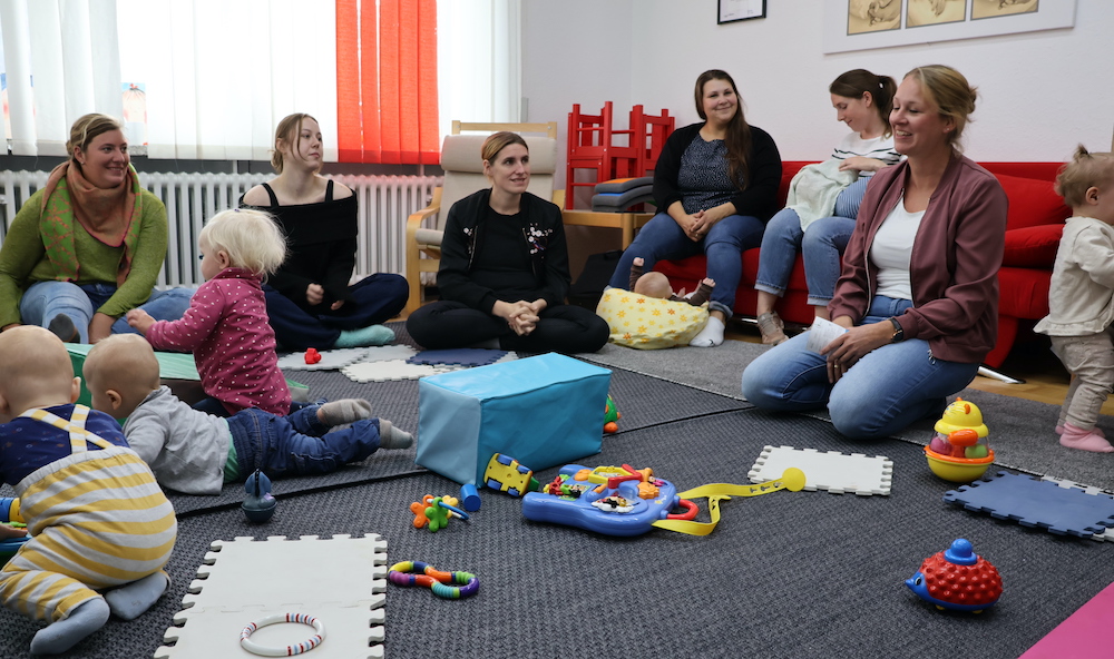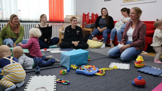 Marie-Christine Birkholz (r.) vom Kinder- und Jugendzahnärztlichen Dienst des Kreisgesundheitsamtes besuchte das Café Kinderwagen in Telgte, um Eltern über die Zahngesundheit bei Kindern zu informieren.