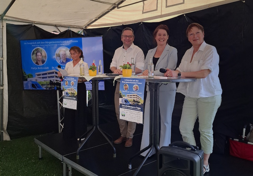 Am 12. Juni 2025 wurde der Pflanzenhof Woltering zur politischen Bühne: Bei einer Podiumsdiskussion trafen Bürgermeisterkandidatin Katja Behrendt (Bündnis 90/Die Grünen) und Dr. Oliver Niedostadek (FDP, unterstützt von der CDU) erstmals öffentlich aufeinander. Rund 200 Bürgerinnen und Bürger folgten der Einladung der Bürgerinitiative B51 und nutzten die Gelegenheit, sich ein direktes Bild von den Positionen der Kandidierenden zu machen.
