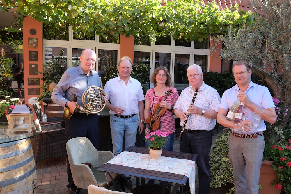 Freuen sich auf ein abwechslungsreiches Konzert bei freiem Eintritt im Hof des Hotels „Im Engel“: Hornist Klaus Wiese, Dirigent Michael Lempik, Violinistin Ulrike Eselgrim, Klarinettist Konrad Ottenheym sowie Weinkenner und Gastgeber Gerhard Leve (v.li.)