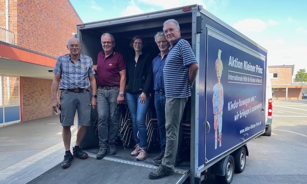 Mit einem großen Hänger und einem Transporter ausgerüstet, sammelte ein Team um Vorstandsmitglied Günther Glose 100 Stühle sowie 11 Computer- und Schultische der Marienschule ein, die vorher vom Hausmeister und Mitarbeitenden der Stadt aus dem obersten Stockwerk nach unten gebracht worden waren. Tage zuvor hatten die Aktion Kleiner Prinz schon 37 Stühle und drei alte Lehrertische der Brüder-Grimm-Schule geladen, die ebenfalls nicht mehr gebraucht wurden.