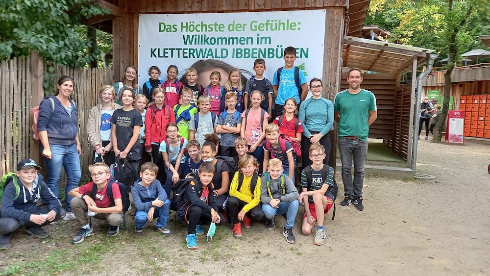 Am Sonntag starteten 28 Kinder / Jugendliche im Alter von 9 bis 13 Jahren und 4 Betreuer/innen mit dem TUS Freckenhorst in den Kletterwald nach Ibbenbüren. Auf Initiative der wieder neu gewählten Jugendwartin Claudia Maibaum konnte aufgrund des Programms „Aufholen nach Corona“ der Stadt Warendorf, dieser rundum schöne Erlebnistag kostenlos für alle Teilnehmer angeboten werden. Bei bestem Wetter und sehr guter Organisation des Anbieters konnten verschiedene Schwierigkeitsgrade ausprobiert und erklettert werden. Schwindelfreiheit war Voraussetzung um bei bis zu 10 m Höhe alles erleben zu können. Auch für das Betreuerteam mit Carolin Freßmann, Lena Tünte sowie Claudia und Björn Maibaum war mit dem Dank an die Stadt Warendorf das Motto des Tages schnell gefunden: „Klettern mit dem TUS – immer ein Genuss“!