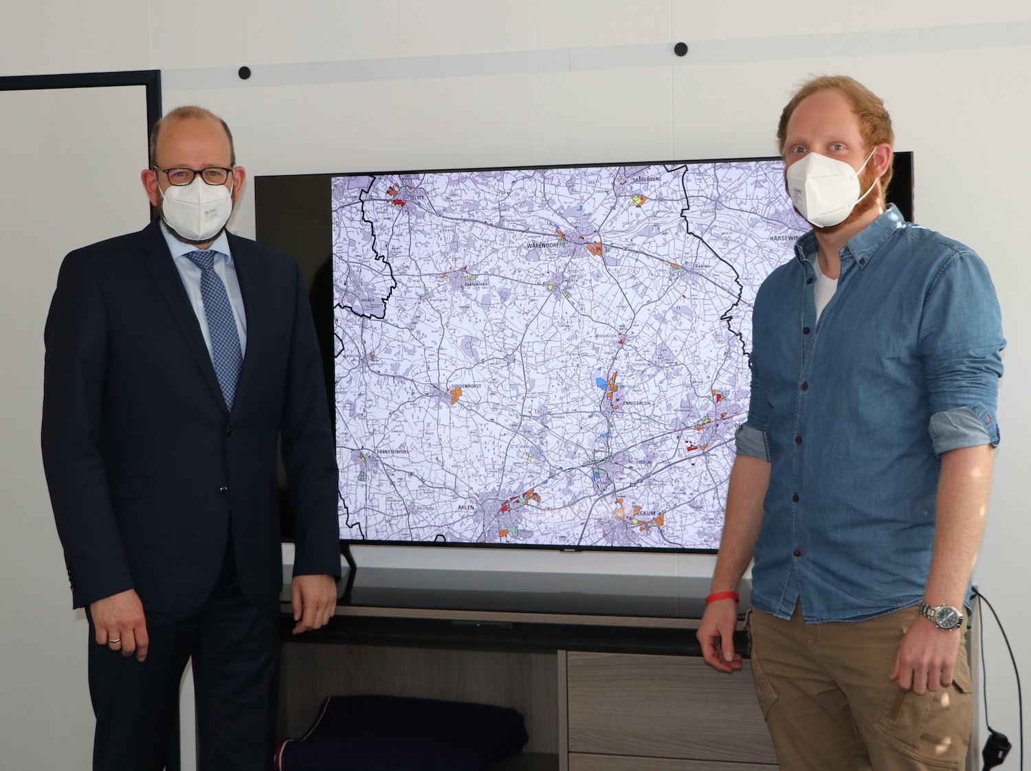 Umweltdezernent Dr. Herbert Bleicher (l.) und Klimaschutzmanager Marcel Richter machen auf das Projekt „KlimaSicher“ aufmerksam, an dem der Kreis Warendorf als einer von drei Modellkreisen beteiligt ist. – Foto: Kreis Warendorf