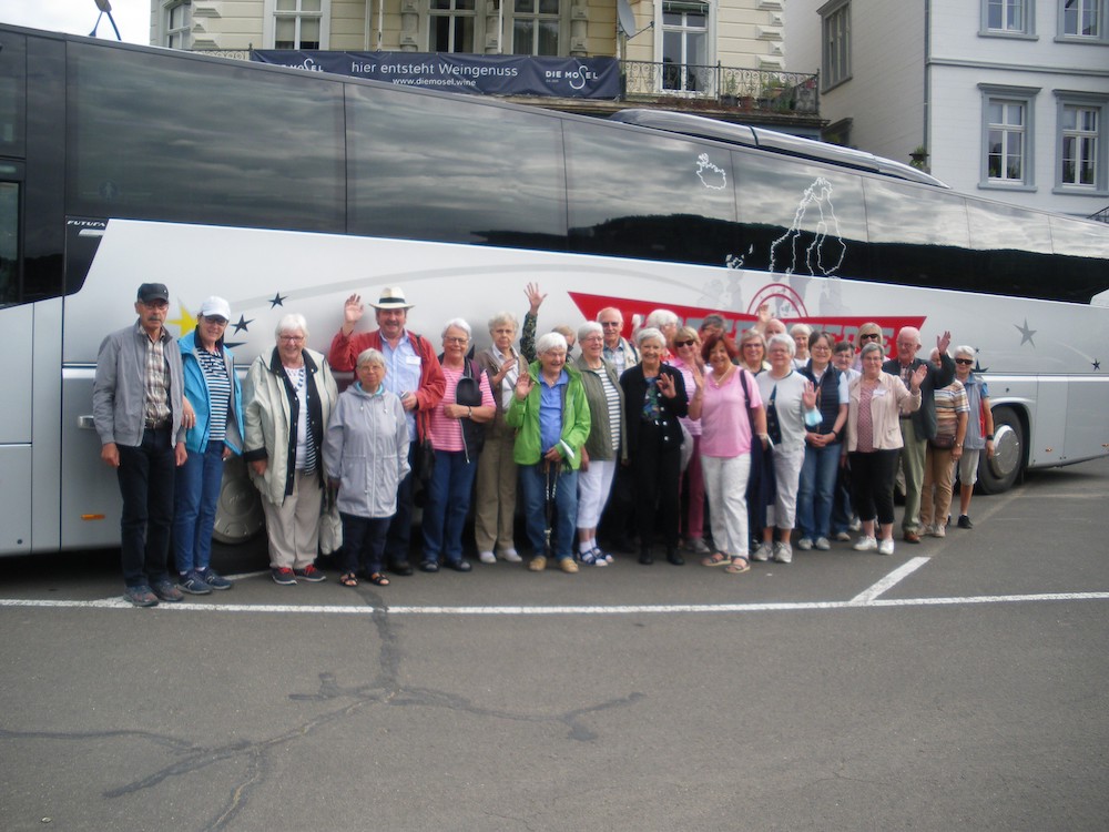 In Bernkastel-Kues angekommen nutzen einige die Gelegenheit zu einer Fahrt mit einem Riesenrad direkt am Schiffsanleger, um einen ersten Blick von oben auf den beschaulichen Weinort zu bekommen. Dann stand auch schon die „Panoramabahn“ zu einer Stadtrundfahrt bis hoch in die Weinberge bereit. Von dort aus hatte man einen herrlichen Ausblick über den Ort und das Moseltal.
