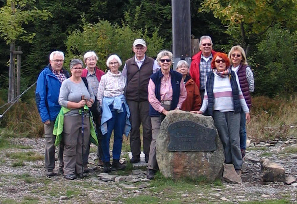 Vom nahe gelegenen Bruchhausen aus starteten die Wanderer am Tag darauf über den Rothaarsteig zu NRWs höchstem Berg. Der Anstieg vom 445 m hoch gelegenen Ort zum 843 m hohen Langenberg war nicht ohne Anstrengung zu bewältigen. Gegen Mittag war der Gipfel erreicht und alle „obenauf“. Bei herrlichem Wetter und klarer Sicht waren die Ausblicke über das „Land der tausend Berge“ ein Genuss.