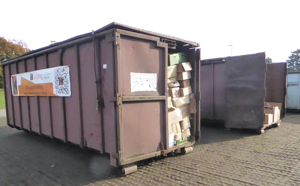 Auf dem Lohwall stehen an diesem letzten Samstag im Monat die von der Kolpingsfamilie Warendorf organisierten Altpapiercontainer bei der Abgabe von Kartonage und Altpapier bereit. Die Abgabezeit endet um 12.30 Uhr.
