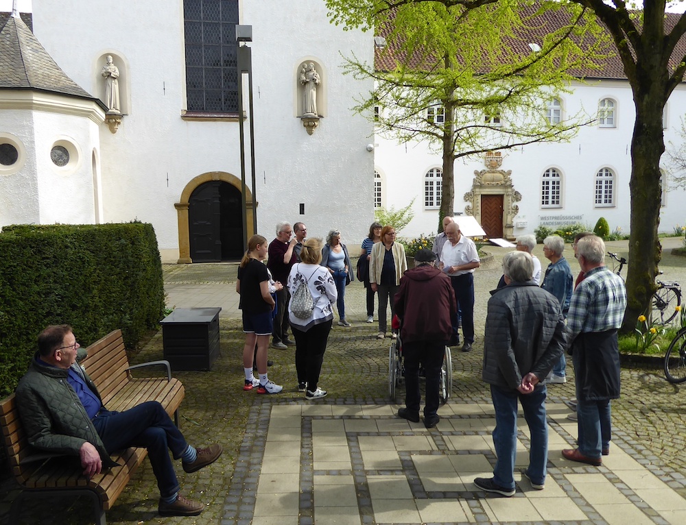 Am vergangenen Samstag nahmen 18 Mitglieder der Kolpingsfamilie Warendorf an der Führung „(Bau-)Geschichte des Franziskanerklosters Warendorf“ teil. Diese Führung wurde zum Tag des offenen Denkmals im September 2022 erstmals angeboten und war damals auf großes Interesse gestoßen. Zuerst erläuterte Gästeführer Werner Stock die Gebäudeteile des Konvents von außen. Dabei erwähnte er auch die ehemaligen Standorte der Marienfelder Kapelle, der späteren Nepomukkapelle, und ersten evangelischen Kirche in Warendorf. 1964 wurde die Kapelle abgebrochen. Auch über die Geschichte der so genannten Absteigequartiere der Klöster Clarholz und Marienfeld wurde informiert. Der ehemalige Ökonomieflügel im Osten wurde von der Promenade aus in Augenschein genommen und die Mariengrotte vorgestellt. Danach erfolgten die Informationen über Bau und Ausbau der Klosterkirche, die eine Zeitlang auch als „Kreissündenvergebungsstelle“ fungierte und mit einem außerordentlich großen Chorgestühl ausgestattet ist. Denn von 1945 bis 1973 studierten am Kloster in Warendorf zahlreiche Novizen der sächsischen Franziskanerprovinz an der philosophisch-theologische Ordenshochschule, die den Rang einer Universität inne hatte. Im Medienraum des Westpreußischen Landesmuseums, der dankenswerter Weise zur Verfügung gestellt worden war, wurde die ganze Geschichte der Franziskaner und des Klosters ab dem 14. Jahrhundert bis zur Eröffnung des Westpreußischen Landesmuseum im Januar 2014 mit einer Powerpoint-Präsentation visuell verdeutlicht. Franz-Josef Hälker dankte am Ende der 90-minütigen Führung im Namen der Kolpingsfamilie und übergab eine Spende der Teilnehmenden in Höhe von einhundert Euro für den Förderverein Kulturgut Franziskanerkloster Warendorf e. V.