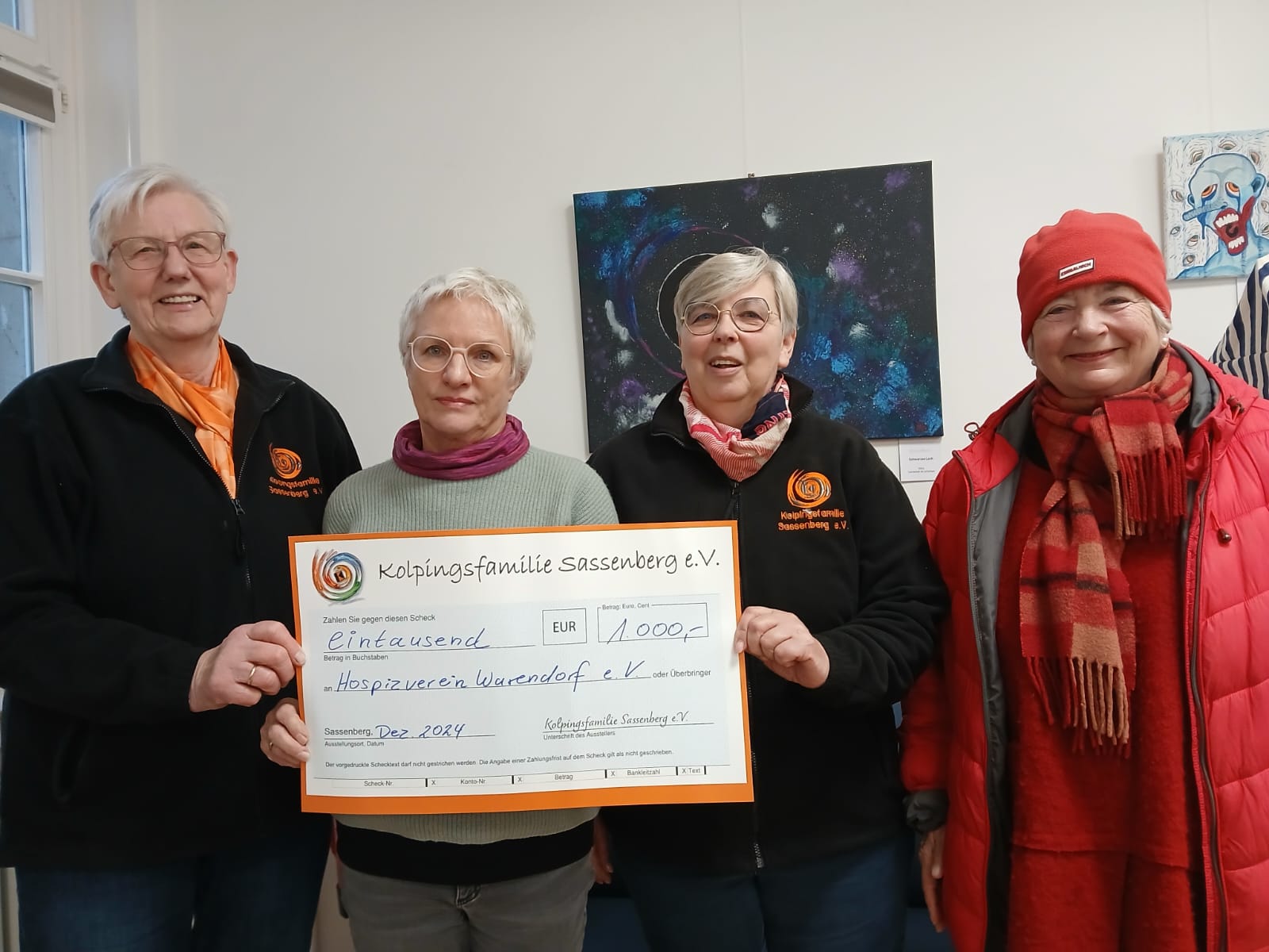 Die Kolpingsfamilie Sassenberg hat 1.000 € an die „Hospizbewegung Kreis Warendorf e.V.“ gespendet. Die Spende wurde am 11. Dezember 2024 durch die stellvertr. Vorstandsvorsitzende Margret Rüschoff unddas Vorstandsmitglied Mechthild Lackamp an Frau Angelika Klager und Ute Diekhans überreicht. Wie genau die Spende genutzt werden soll, steht noch nicht fest.