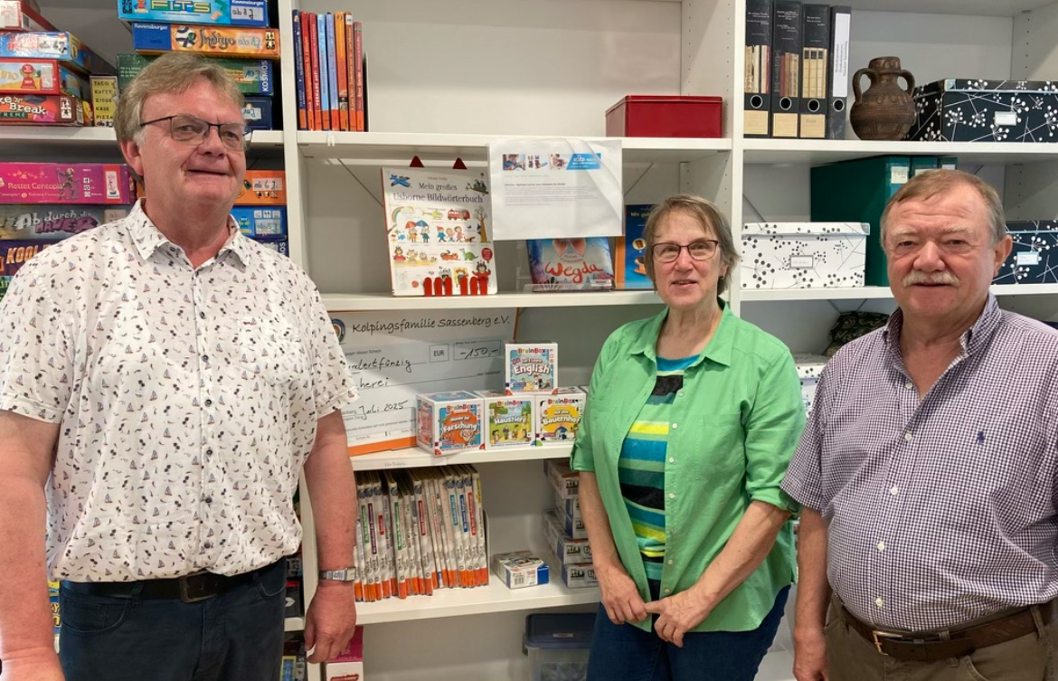 Die Kolpingsfamilie Sassenberg hat 150 an die kath. Bücherei in Sassenberg gespendet. Die Spende wurde am Sonntag, den 20. Juli 2025 durch die Vorstandsmitglieder Thomas Diekmann und Theo Sparenberg an die Leiterin der Bücherei Frau Hiltraut Bergmann überreicht. Von einem Teil der Spende hat die Bücherei bereits Brain Boxen angeschafft. Brainboxes sind schnelle Gedächtnisspiele, die weder Stift noch Papier oder ein Spielbrett benötigen.