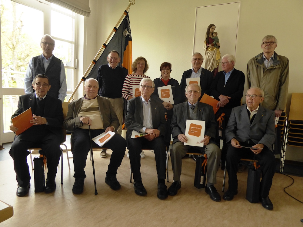 Für ihre mehrjährige Mitgliedschaft in der Kolpingsfamilie Warendorf wurden geehrt Paul Gaida (65 Jahre) (sitzend von links), Hermann Wohlers (60 Jahre), Heinz Eggersmann (65 Jahre), Helmut Fligg (70 Jahre), Werner Mester (65 Jahre). Stehend von links Manfred Wagner (Vorstandsteam), Emil Brokamp (65 Jahre), Ingrid Hülsmann (40 Jahre), Anne Löhrs (40 Jahre), Clemens Lüffe (40 Jahre), Hermann Zelleröhr (65 Jahre), Karlheinz Fiege (40 Jahre).